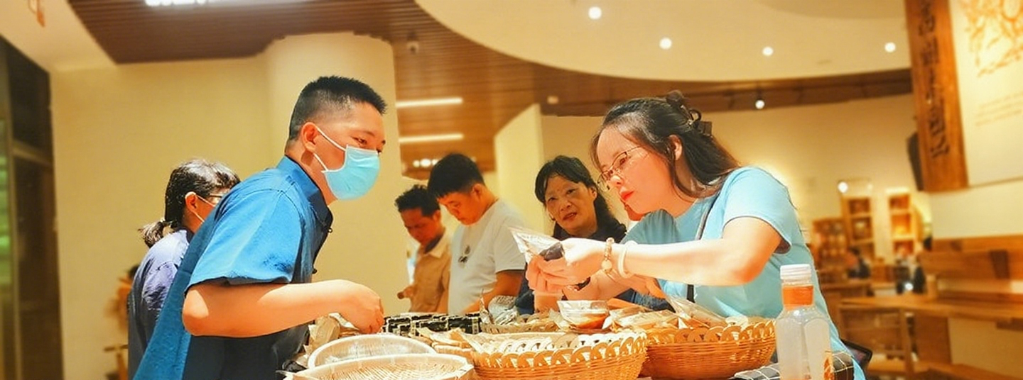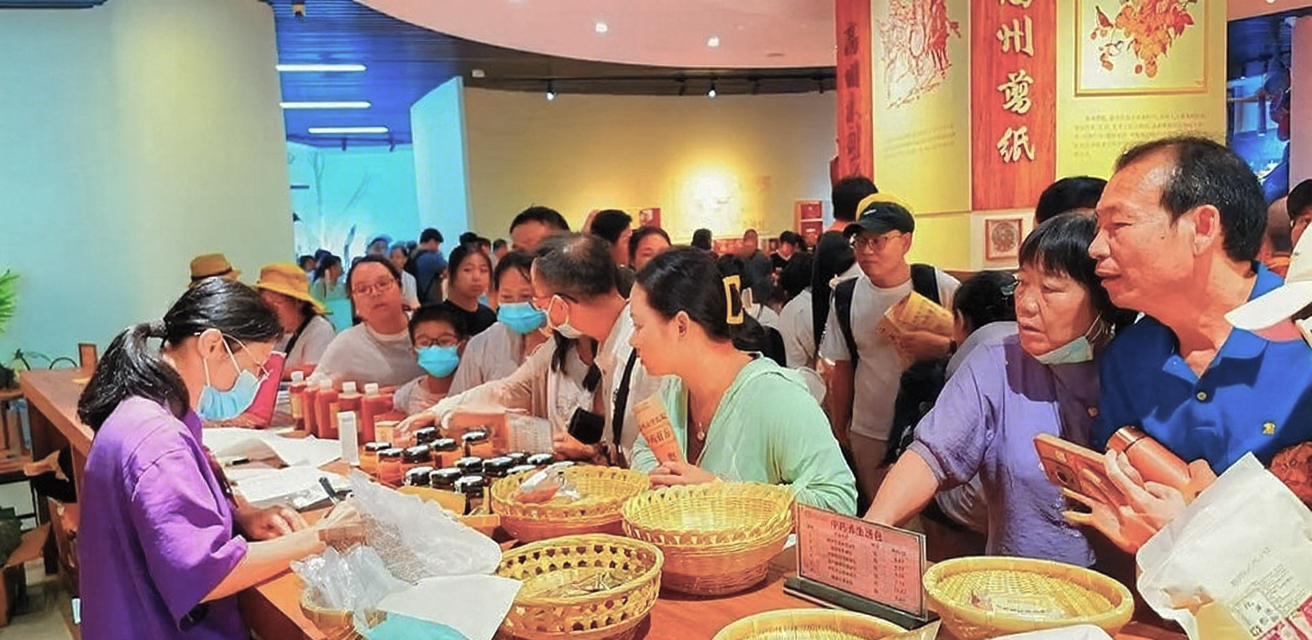 在潘茂名中医药文化体验工坊的陈列区,高州市中医院自制的健脾祛湿膏、秋梨润肺膏、健肝膏等二十多种中药膏方整齐排列。这些膏方不仅具有养生功效,还蕴含着深厚的文化底蕴,不少旅客将其作为兼具养生与文化特色的伴手礼选购。一位游客拿起一盒健脾祛湿膏,仔细端详着包装上的介绍,说道:“这膏方看着就不错,比较养生,带回去给家里老人尝尝。”